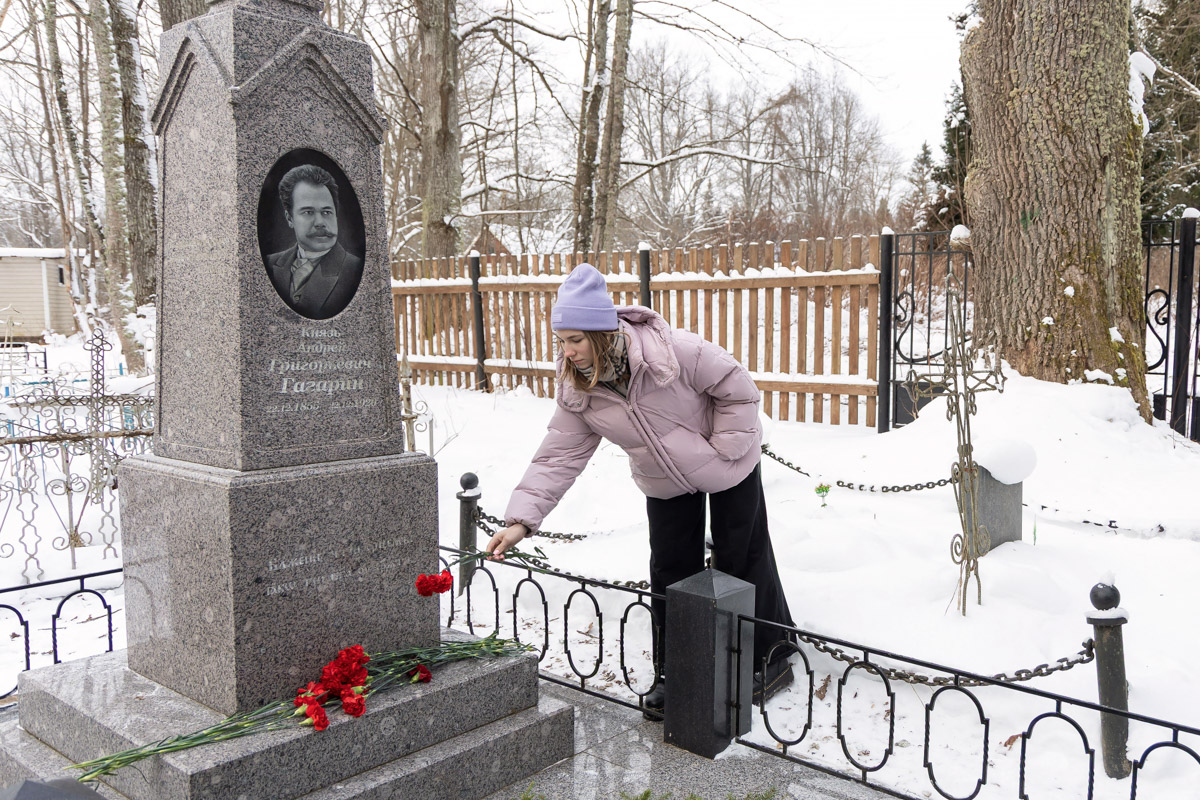 После экскурсии делегация направилась в село Бельское Устье, чтобы почтить память основателя университета. У могилы князя Андрея Григорьевича Гагарина настоятель храма Вознесения Господня протоиерей Александр Баранов отслужил панихиду. В ней приняли участие выпускники, студенты и сотрудники Политеха разных поколений, а также праправнучка Андрея Гагарина Софья Короткова. После богослужения к надгробию возложили венок от Санкт-Петербургского политехнического университета Петра Великого, к которому каждый смог добавить свои цветы, отдав дань уважения и памяти первому директору вуза.
